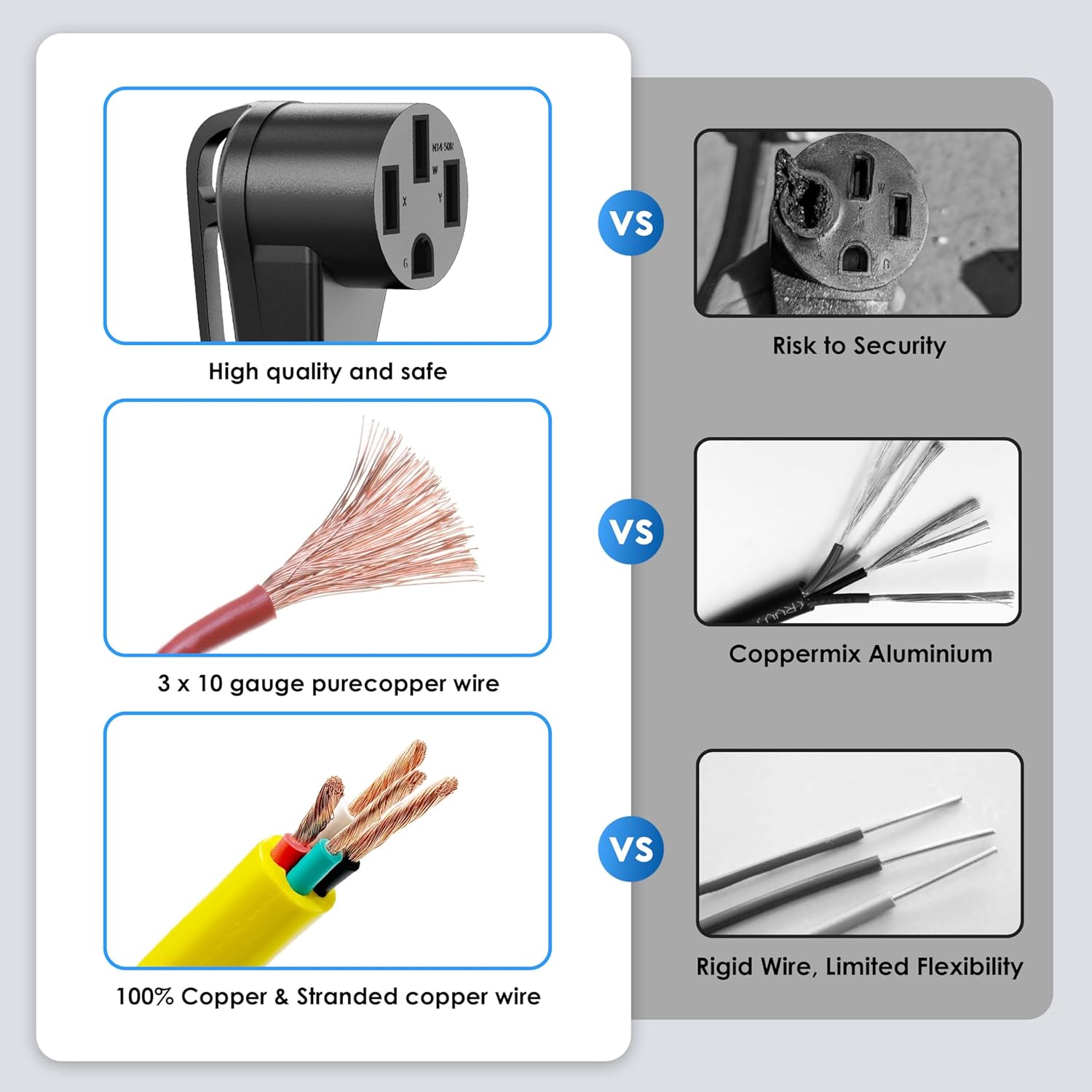 - FEMALE CONNECTOR: Two 30 Amp NEMA 10-30R 125/250 Volt for dryer plug and EV charging