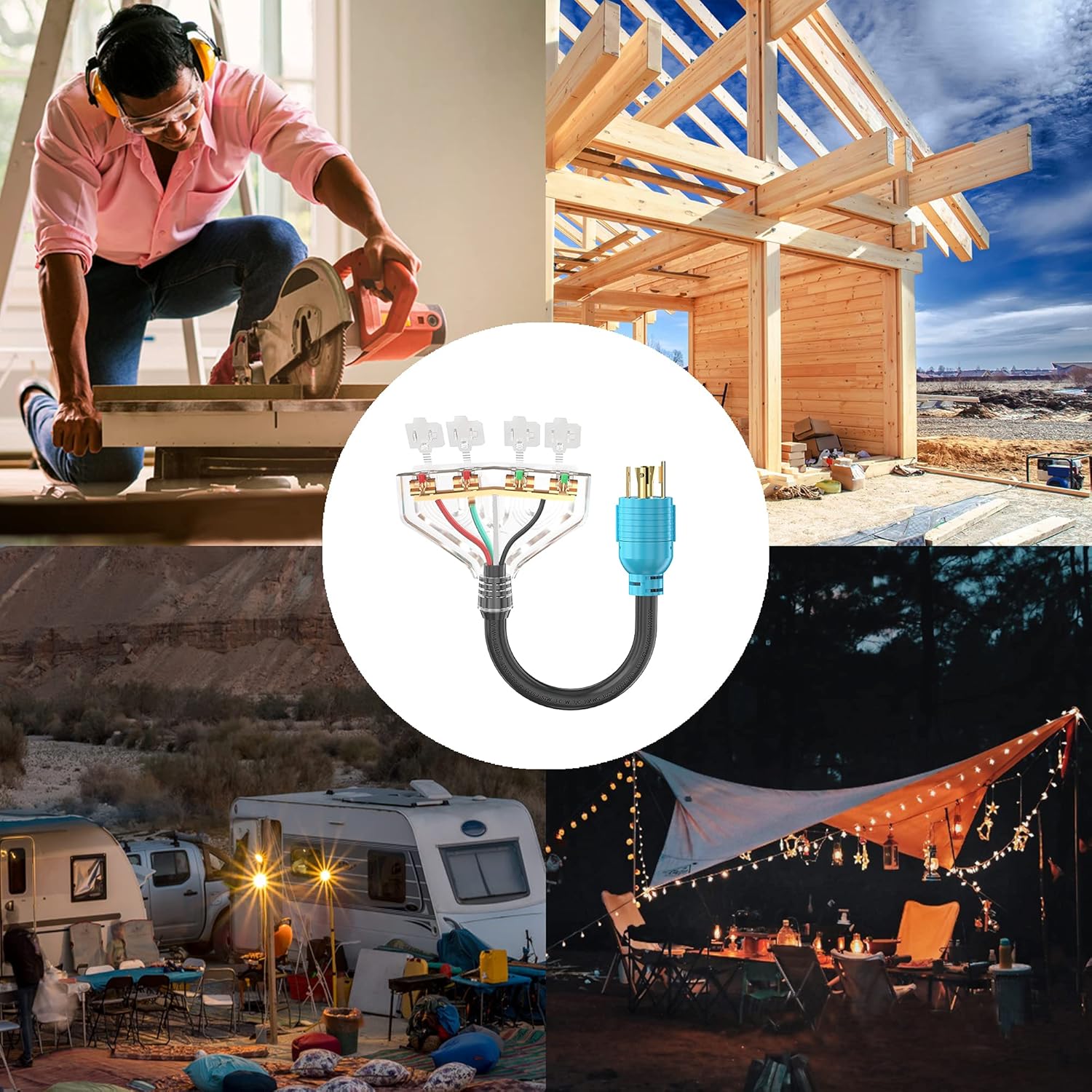 - Electrical Rating: NEMA L14-30P male for RV or generator power socket, 4X NEMA 5-15/20R T-Blade household connectors for household electrical appliances and tools, 10 Gauge 30 Amp 125/250V 7500W 12 inch. ETL Listed