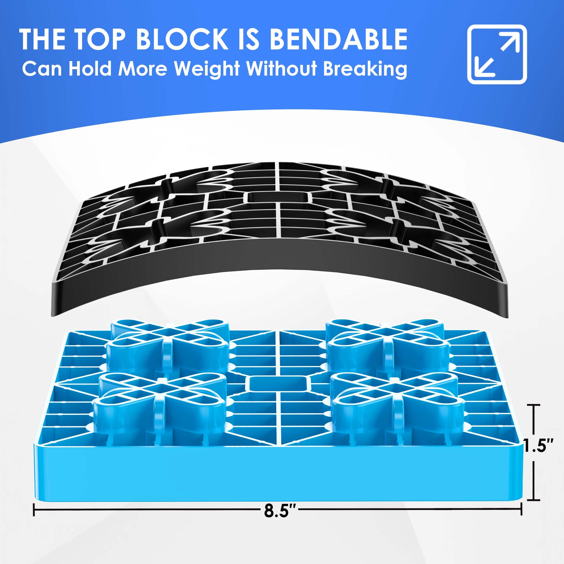 - 12 Pcs Leveling Blocks: Kit includes 10 leveling blocks & 2 top blocks and storage bag. Each Leveling Blocks measure 8.5" x 8.5" x 1.5", top Blocks measure 8.5" x 8.5" x 0.7".