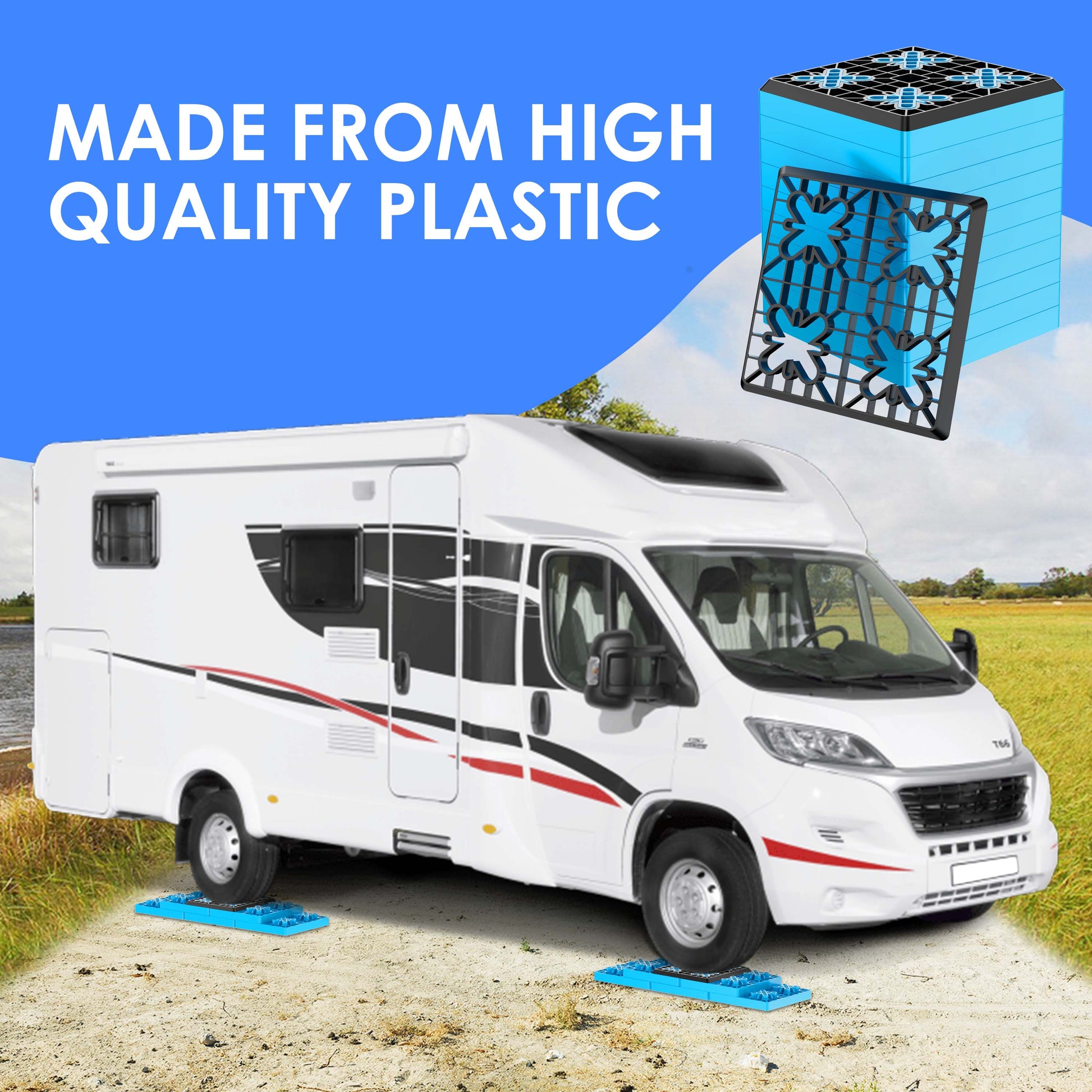- Reliable Material: Made from high-quality and sturdy materials, our RV Leveling Blocks are built to withstand tremendous weight and provide long-lasting performance. Solid bottom structure prevents them from sinking on soft ground. It can also be used as a support base for other stabilizing equipment.