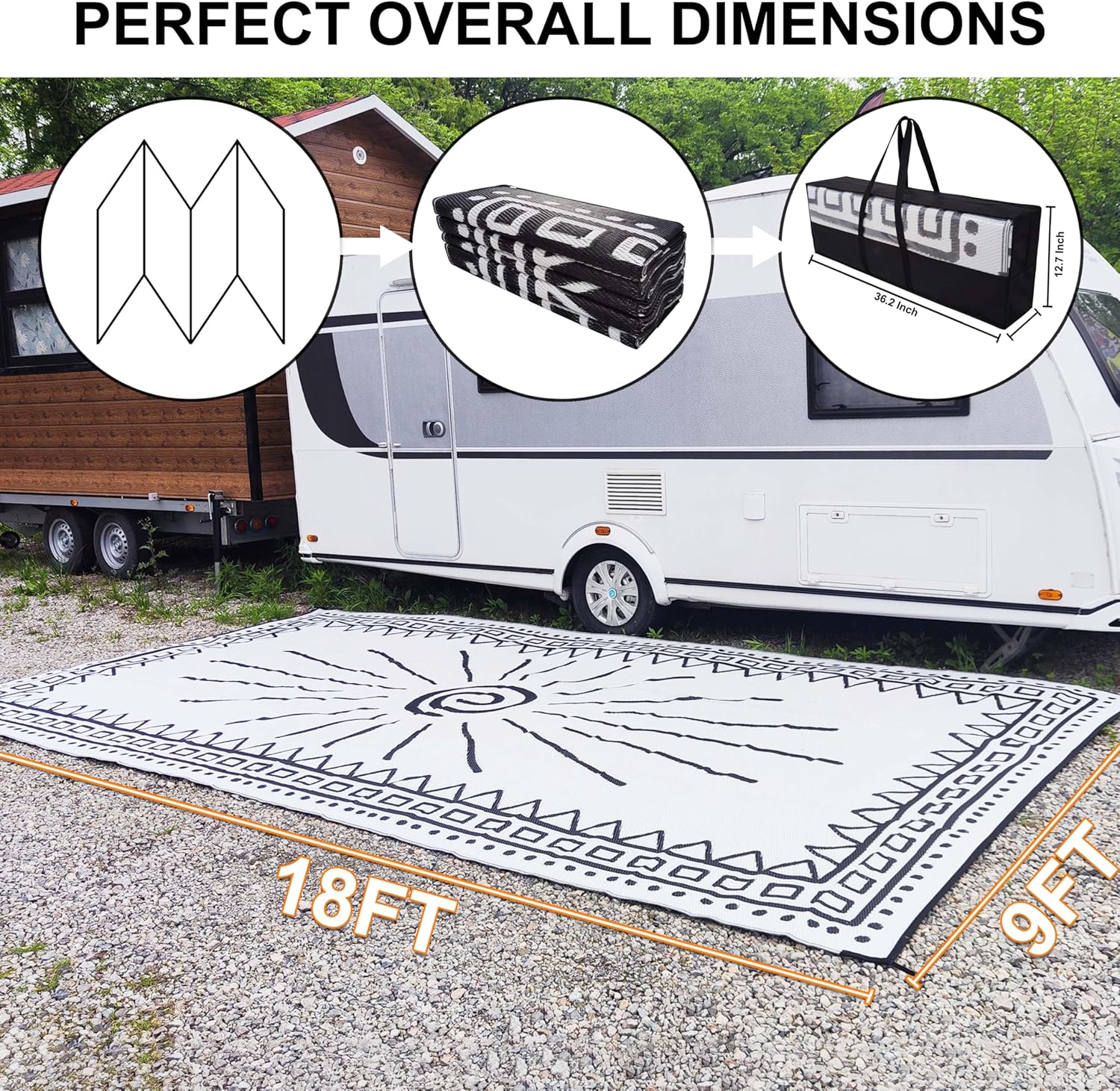 - HUGE SIZE: you and your family can enjoy a comfortable and pleasant journey at the beach or outside your RV. This RV rug for outside are huge and it gives a lot of room to keep out of your rv. Enjoy your comfortable camping.