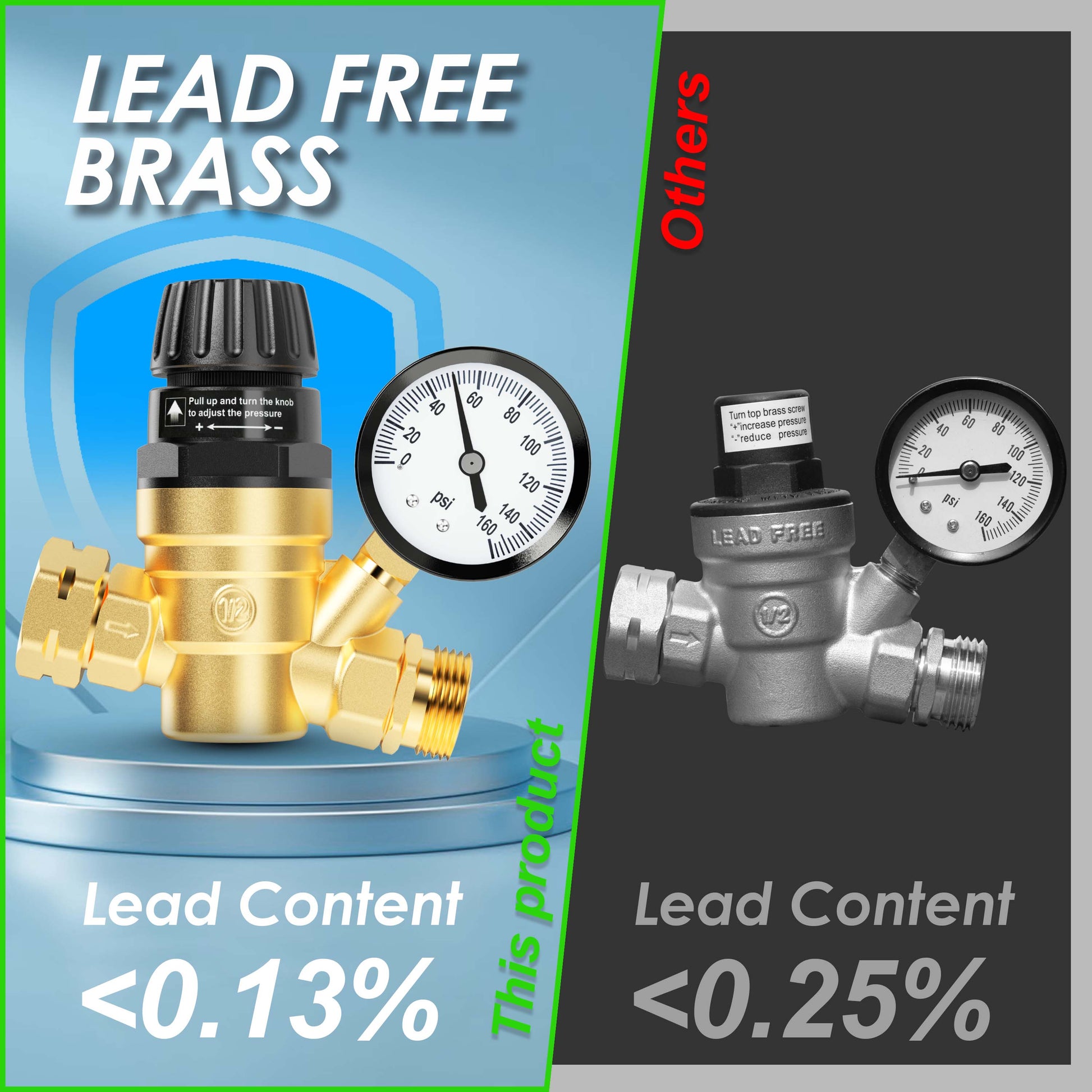 RV Water Pressure Regulator Valve, Brass Lead-Free Adjustable Water Pressure Reducer with Gauge and Inlet Filter for RV Camper and Travel Trailer