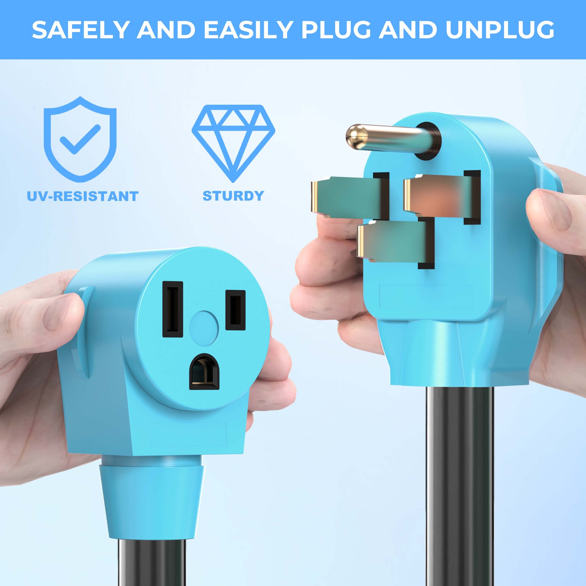 - Male Plug: 50 Amp NEMA 14-50P male plug connect to RV or generator power socket